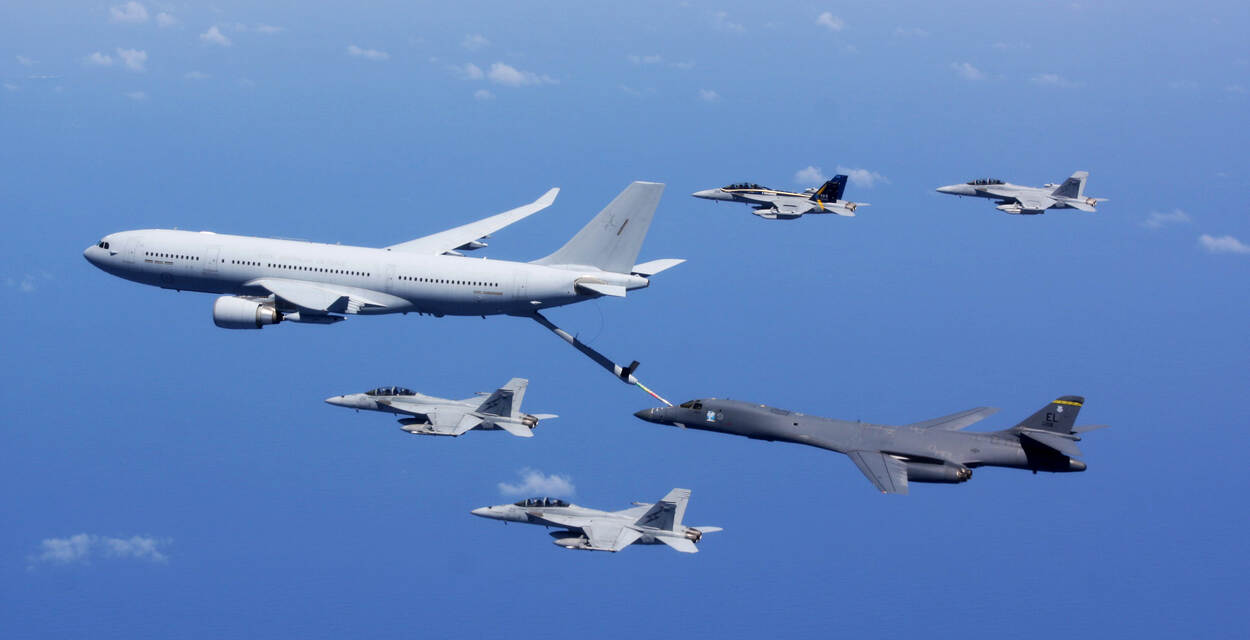 Foto onder: Een KC-30 met een Amerikaanse B-1B op ‘sleeptouw’, geflankeerd door Australische Super Hornets en Growlers.