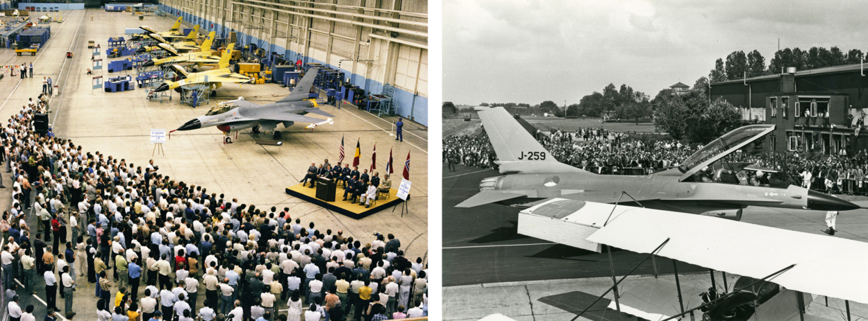 Heel anders was de overdracht van de eerste productie F-16 op 18 augustus 1978, zie foto's hierboven. Dat toestel werd afgeleverd aan de USAF, in het bijzijn van de 4 partnerlanden België, Denemarken, Nederland en Noorwegen. De eerste Nederlandse F-16 wordt op 13 september 1978 met een C-5 Galaxy op Schiphol afgeleverd bij Fokker en op 7 juni 1979 aan de KLu op Leeuwarden.