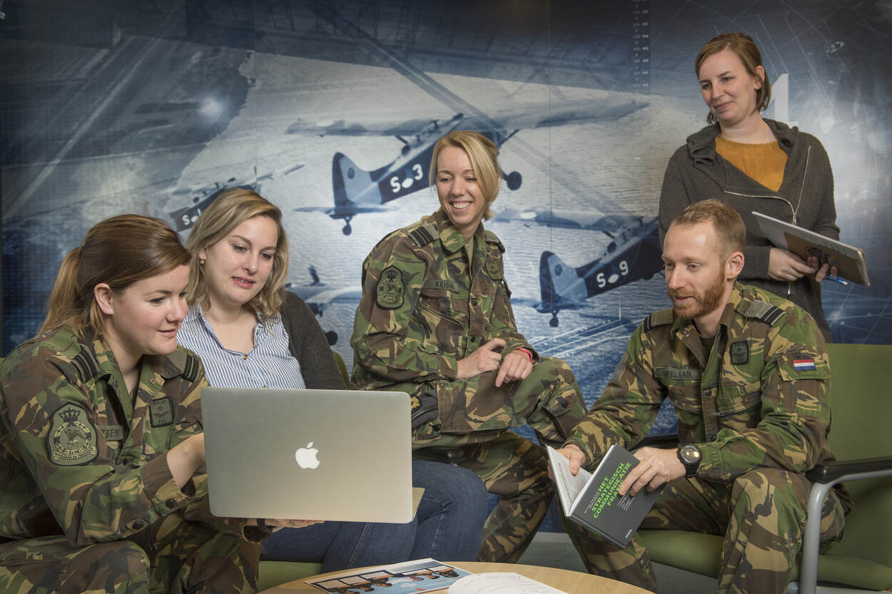 Een werkoverleg tussen een paar leden van de werkgroepen ‘Corporate Story’ en ‘Toolbox’. In het midden majoor Karen Keissen, Plaatsvervangend hoofd Luchtmachtcommunicatie en initiatiefnemer van de projecten. Zittend rechts kapitein Kevin IJpelaar, voorzitter van de werkgroep die de toolbox vormgaf.