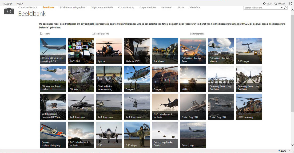 Deze beeldbank is voor iedere luchtmachter (en andere defensiemedewerkers) bereikbaar via de online toolbox op intranet. Doorlopend komen er nieuwe beelden bij en worden nieuwe onderwerpmapjes toegevoegd.