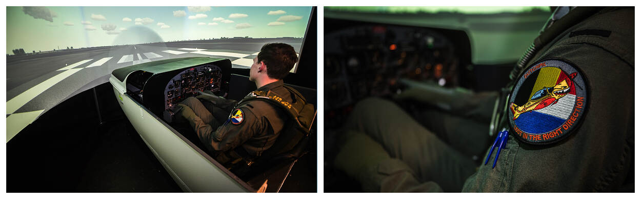 Voor de vliegers in opleiding plaatsnemen in een vliegtuig, oefenen ze eerst een paar uur in een simulator.