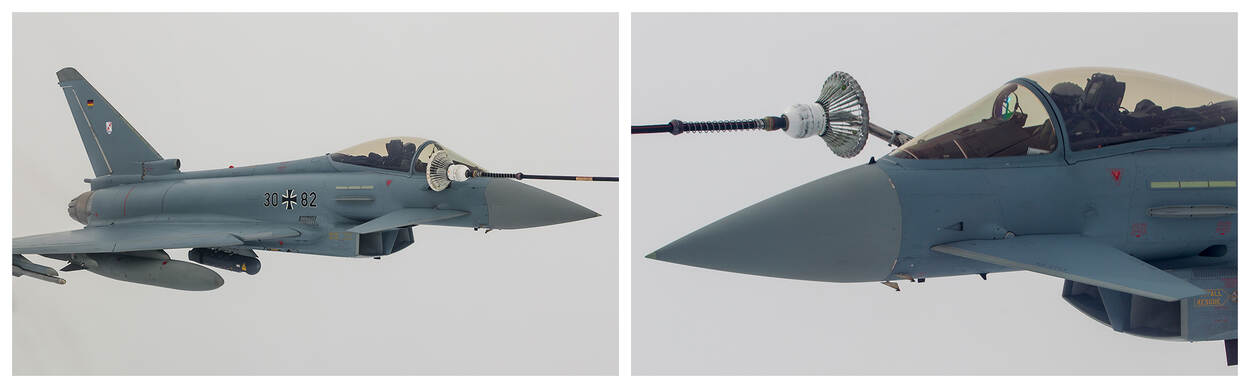 Op Eindhoven is het prachtig weer met een bijna strakblauwe lucht. Boven de Noordzee is het in de 3 air refueling-gebieden, die tijdens de EART in gebruik zijn, net even anders. Bewolkt en het waait er behoorlijk. Niet zo’n probleem voor de tankers, zoals de Duitse A330 MRTT, die er rustig zijn rondjes vliegt in de zogenoemde racetrack. Voor de receivers, jachtvliegtuigen van de oefening Frisian Flag, is het net even anders. Probeer maar eens met de tankstang van je vliegtuig een voor je heen-en-weer wiebelend mandje aan een brandstofslang te pakken te krijgen. Na een kwartiertje proberen lukt het de vlieger van de Duitse Eurofighter uiteindelijk contact te krijgen. Snel tanken en terug naar het luchtgevecht dat zich elders boven de Noordzee afspeelt.