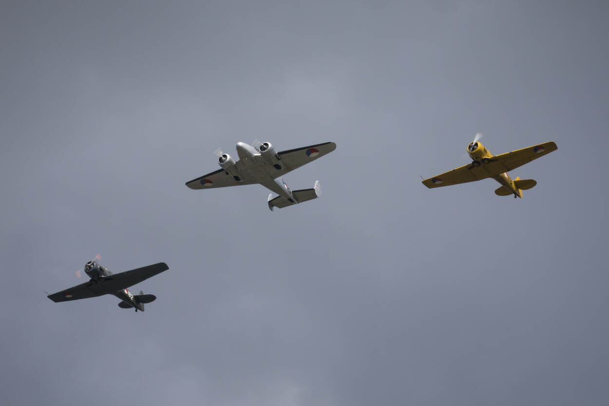 De minister vervolgde. "Steeds minder overlevenden kunnen ons direct vertellen hoe het was om te leven in angst en gevaar en met schaarste. Daarom is het zo goed dat we mijlpalen als deze vieren: vrijheid.” Op de foto 2 Harvards en de Beech van de KLu Historische Vlucht. Foto: Arjan Vrieze, www.tracesofwar.nl