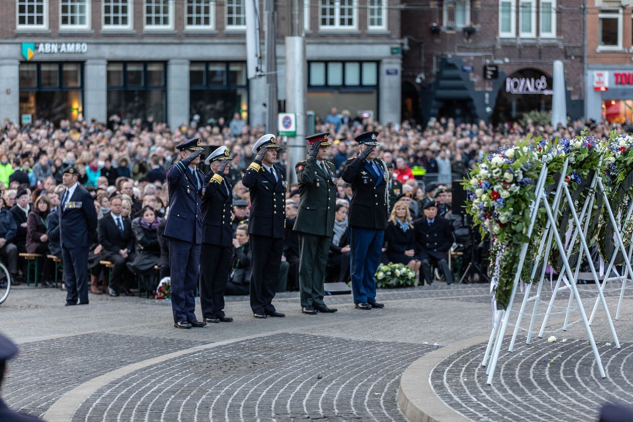 Op en rond de Dam in Amsterdam was een ruime luchtmachtafvaardiging aanwezig, met onder andere Ridder MWO reservemajoor Roy de Ruiter en de erewacht. Commandant der Strijdkrachten luitenant-admiraal Rob Bauer legde er samen met de andere OPCO-commandanten onder wie C-LSK Luyt, een krans namens Defensie. Foto: Tim van Rijt