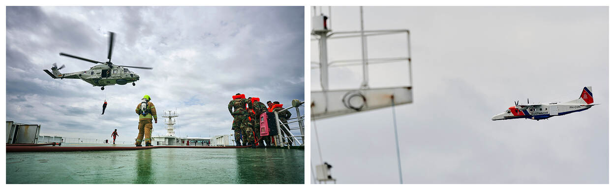 Opdracht was 400 mensen redden vanaf d P&O-ferry Pride of Hull. De opvarenden verlieten het 215 meter lange schip op de meest uiteenlopende manieren. Zo konden mensen weg met de sloepen die aan weerszijden hangen. Ook het evacuatiesysteem werd geactiveerd (opblaasbare glijbaan en vlotten). Zij werden onder meer opgevangen door reddingsboten van. En dan waren er nog tientallen mensen die de ferry per heli konden verlaten. Daarvoor werd onder andere een NH90 van het 860 Squadron ingezet. Een van de Dornier Do.228’en van de Kustwacht hield de situatie vanuit de lucht in de gaten. Livex vindt eens in de 5 jaar plaats. Foto boven: Marco Ferrageau. Foto’s onder: Phil Nijhuis