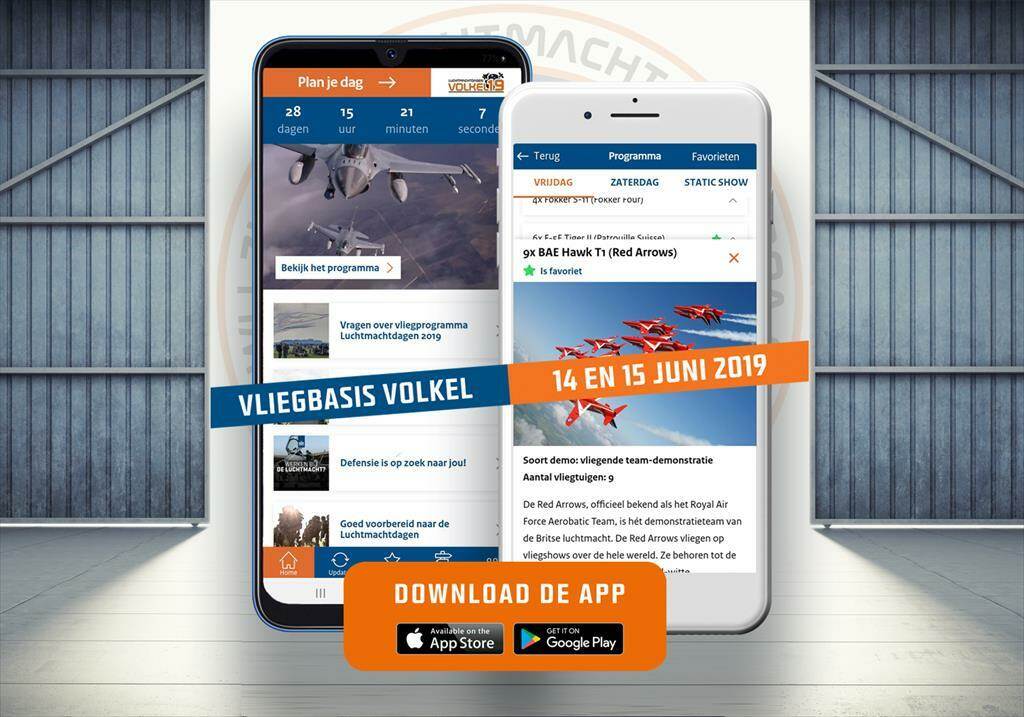 De officiële smartphone-app voor de Luchtmachtdagen op 14 en 15 juni 2019 is inmiddels te downloaden in de Google Play Store (Android) en de Apple App Store (iOS). De app voorziet bezoekers en personeel tijdens de Luchtmachtdagen op Volkel van praktische informatie en het laatste nieuws. Daarnaast heeft de Luchtmachtdagen-app ook een speciaal medewerkersgedeelte.