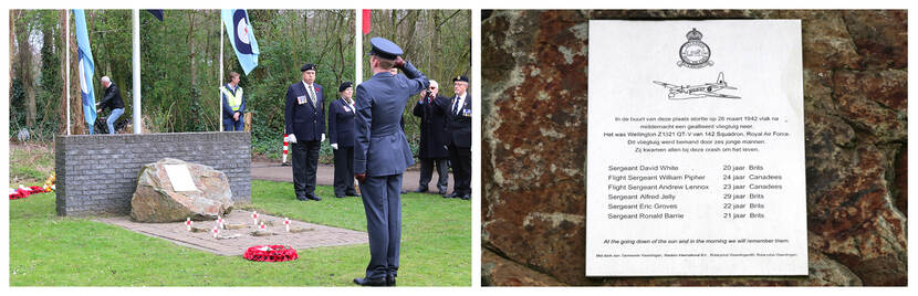 In de Nacht van 25 op 26 maart 1942 stortte ten noorden van Vlaardingen de Britse Wellington bommenwerper Z1321 QT-V van het RAF No.142 Squadron neer. Daarbij kwamen de 4 Britse en 2 Canadese bemanningsleden om het leven. Het toestel was op de terugweg van een bombardementsvlucht met 252 toestellen op de stad Essen. Boven Rotterdam en Vlaardingen werd het toestel geraakt door luchtafweer geschut en stortte neer. Op 15 juni 2012 is er nabij de plaats van de crash een monument onthuld ter nagedachtenis van de crew. Dit jaar was de herdenking op 23 maart. Foto’s boven: Paul Meuldijk