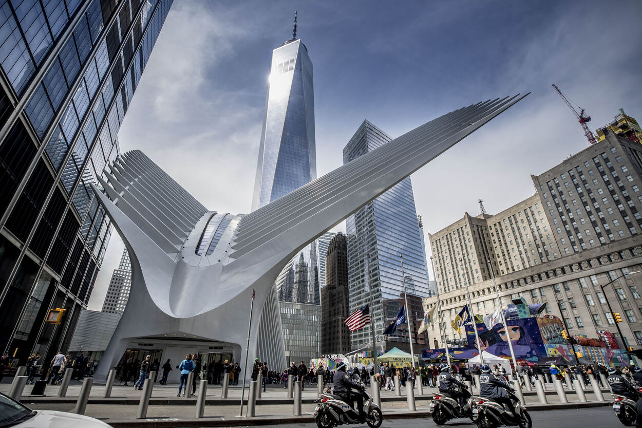Van begin jaren 70 tot 2001 stonden hier de Twin Towers. Nu staat op de punt van Lower Manhattan het nieuwe 541 meter hoge One World Trade Center, ook wel bekend als de Freedom Tower. Op de voorgrond het metrostation.