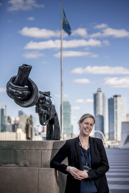 Ellen Regeling bij de ingang van het VN-hoofdkwartier. Ze staat voor het bronzen beeldhouwwerk Non-Violence: een reusachtig pistool met een knoop in de loop.