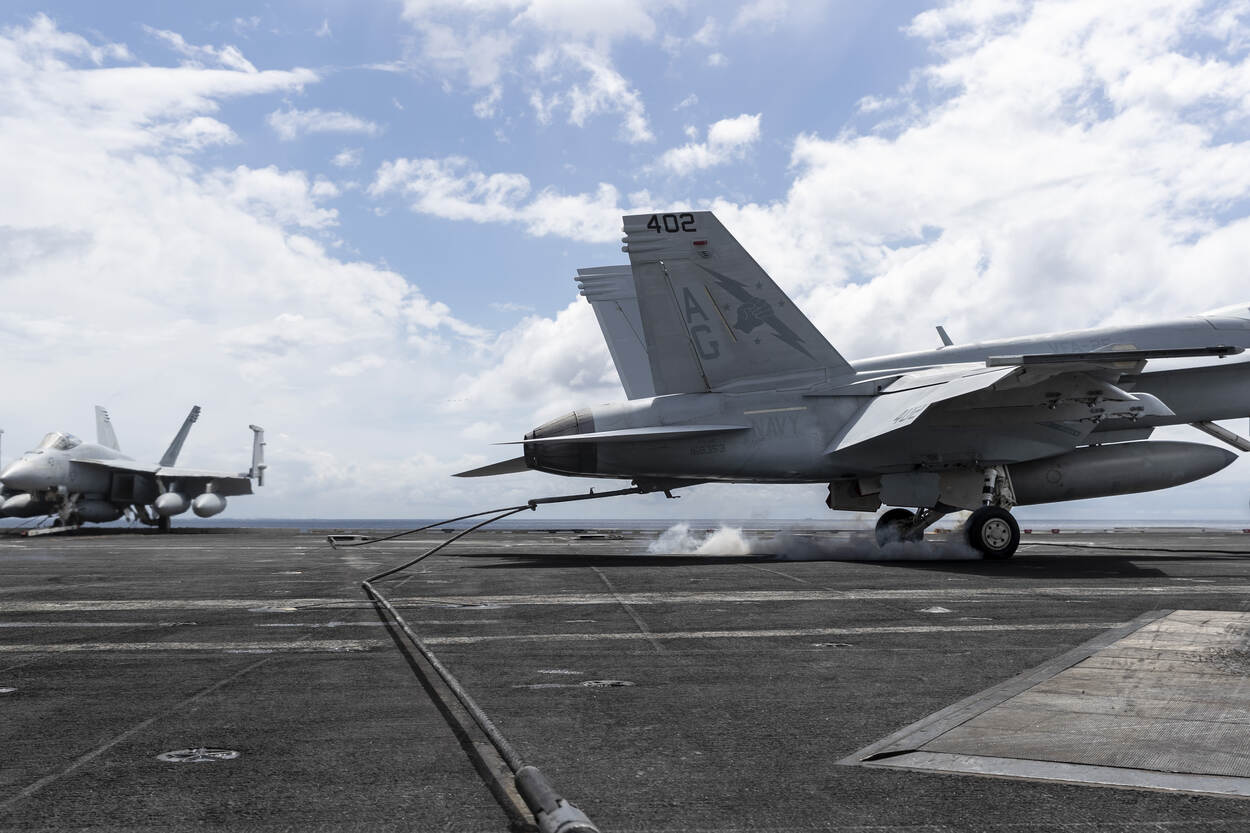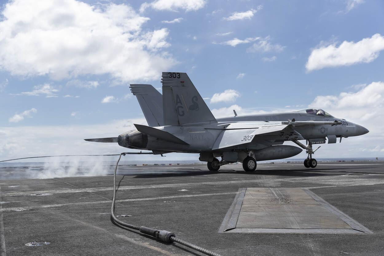 Zien hoe een F/A-18 Hornet weer aan boord terugkomt? Bekijk dan deze carrousel.