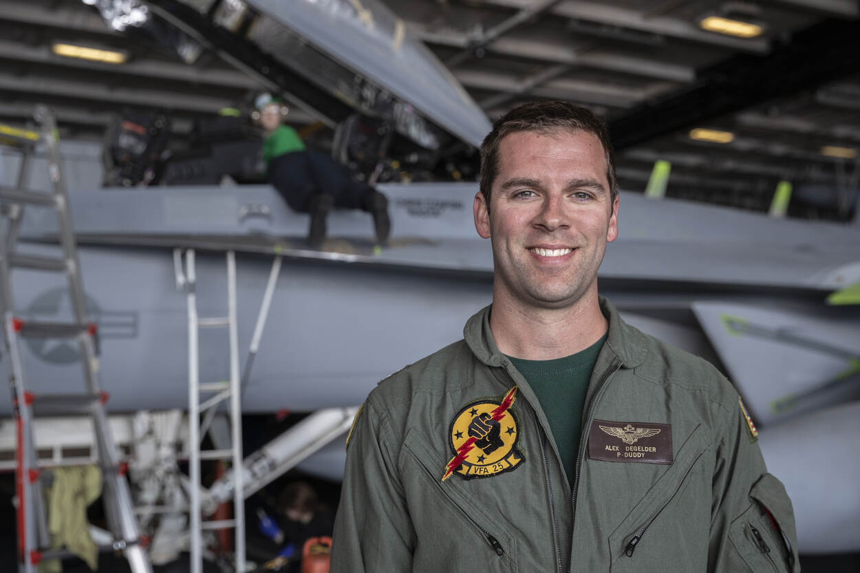 De variatie daar is een heel ander verhaal dan, pak ‘m beet, een paar decennia geleden. Toen had ieder vliegtuigtype zijn eigen specifieke offensieve of defensieve taak. Dat is nu ondergebracht in 1 airframe: dat van de Super Hornet. “Het is een geweldig vliegtuig dat alles kan”, zegt vlieger lieutenant Alex Degelder. “Niet supergoed in 1 ding, maar behoorlijk goed in alles.”
