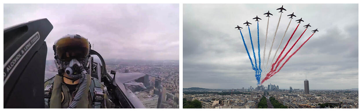 Dit jaar was het thema Europese defensiesamenwerking. Tijdens de militaire parade op de Champs-Elysees, deden daarom in totaal 4.000 militairen mee van de 10 landen van het Europese Interventie Initiatief. Onder hen ook Nederlandse landmachtmilitairen. Op uitnodiging van de Franse president Emmanuel Macron woonden minister-president Mark Rutte en minister van Defensie Ank Bijleveld-Schouten het schouwspel bij. Foto l.: Dassault. Foto r.: KLu