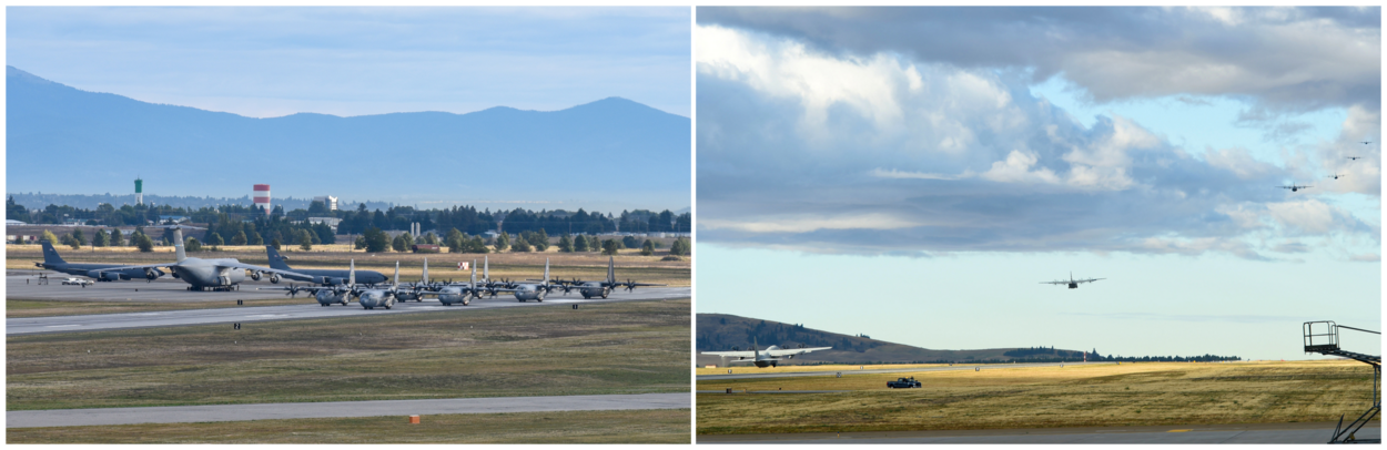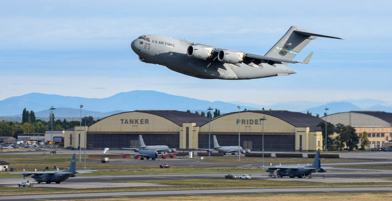 Een Amerikaanse C-17 stijgt op van Fairchild AFB, het thuis voor 2 wings met 4 squadrons en 59 KC-135 tanker- en transportvliegtuigen, al ligt de nadruk duidelijk op de eerste functie van de toestellen.