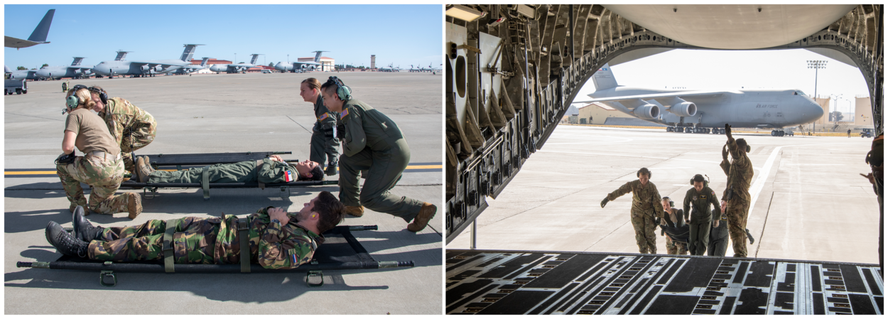 De KDC-10 draaide niet mee in het humanitaire scenario, maar Nederlands personeel wel als oefengewonden zoals hier samen met een Chileense collega tussen de C-5’en KC-10’en en C-17’s op Travis AFB.