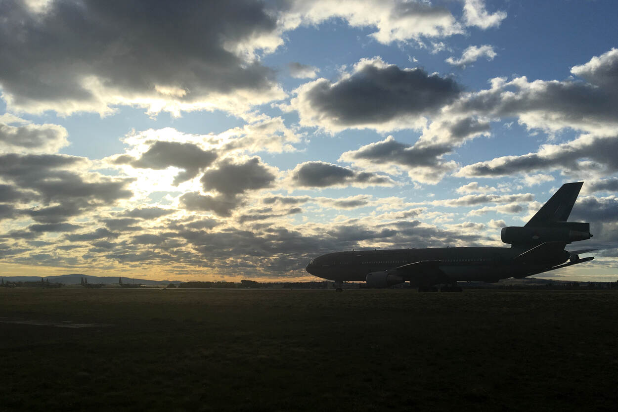 Als laatste in de zogenoemde elephant walk sluit de KDC-10 aan. Op de kop van de baan staan al 7 C-130’s klaar. Foto: 334 Squadron