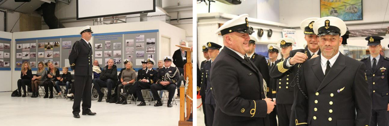 Kapitein-luitenant ter zee Hans Veken, Chef Staf van het Defensie Helikopter Commando, rekte Scholte het erekoord uit in de traditiekamer op De Kooy. Rath kreeg het op 19 november uitgereikt op de Marinebasis Den Helder. Foto’s Defensie