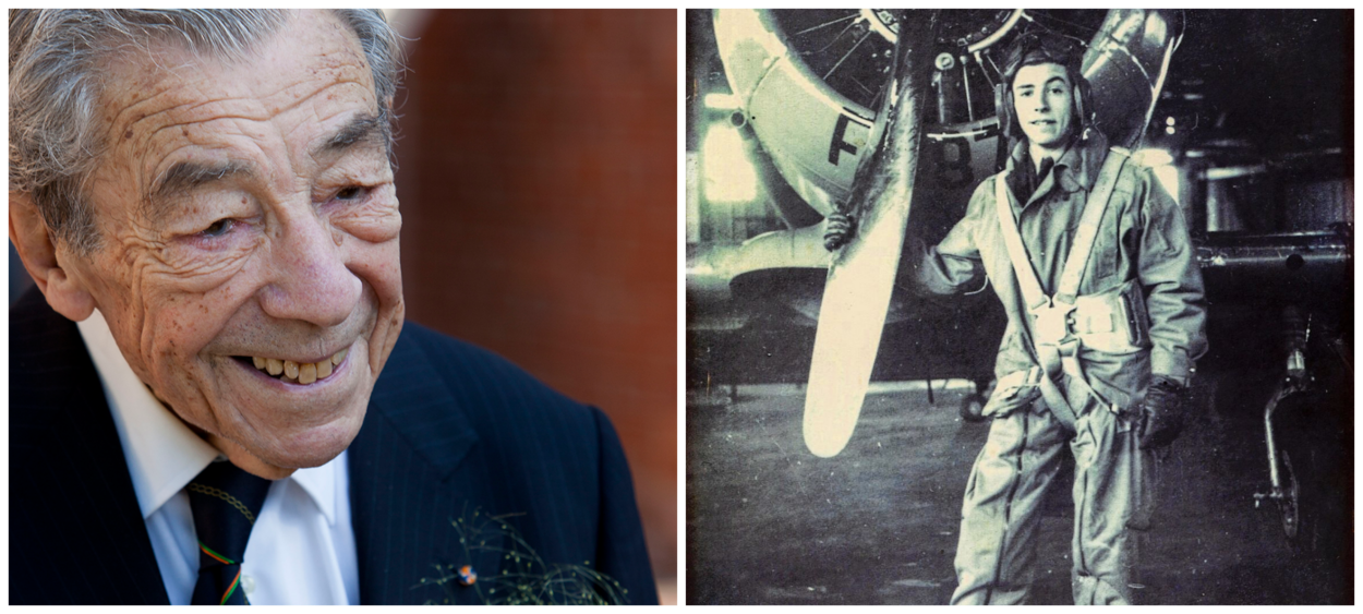 Foto links: Eddy Jonker dik 5 jaar geleden op een reünie van het Genootschap Engelandvaarders op landgoed De Zwaluwenberg in Hilversum. Foto: sergeant-majoor Maartje Roos. Foto rechts: Eddy Jonker bij een Harvard na het behalen van zijn wings bij de No.13 Service Flying Training School van de Royal Canadian Air Force in North Battleford, Saskatchewan, Canada.