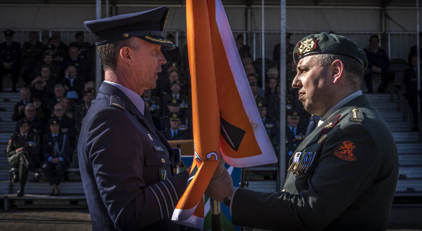 Het commando over de Groep Luchtmacht Reserve (GLR) is sinds vrijdag 6 maart in handen van kolonel Michel Brevink. Hij nam het bevel over van kolonel Raymond Kramer, die na 2 jaar afscheid nam. Brevink was hiervoor commandant Coördinatiecentrum Expertise Arbeidsomstandigheden en Gezondheid (CEAG). Foto: Emily van der Spoel.