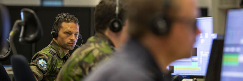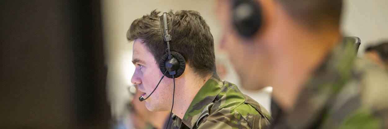 Fighter Controller Mark werkt tijdens de hele oefening samen met gevechtsleiders sergeant Mark en kapitein Martijn om alles in goede banen te leiden.