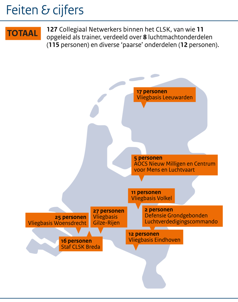 Kun jij goed luisteren en help je anderen graag? Dan is een nevenfunctie als Collegiaal Netwerker misschien iets voor jou. Een opleiding hiervoor kun je volgen via de Koninklijke Militaire School Luchtmacht (KMSL). Meld je, in overleg met je leidinggevende, aan bij de coördinator van het Collegiaal Netwerk op jouw onderdeel. Via deze intranetpagina (alleen bereikbaar via Mulan) vind je de contactgegevens. Voor meer informatie kun je ook terecht bij majoor Rob van Eerden (in Outlook te vinden als R.G.M. van Eerden).