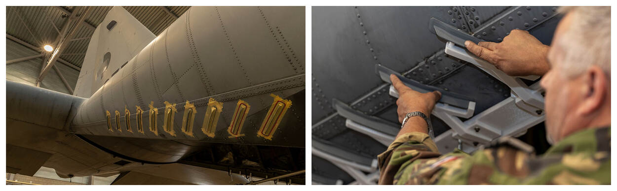 Vliegtuigplaatwerkers en schilders van de Vliegbasis Eindhoven brengen de microvanes met een speciale mal en lijmtechniek aan op de huidbeplating van de Hercules. De nieuwe vliegtuigonderdelen zijn bespoten met de nieuwe chromaatvrije verf, waarmee binnenkort de beplating van alle Herculessen wordt voorzien.