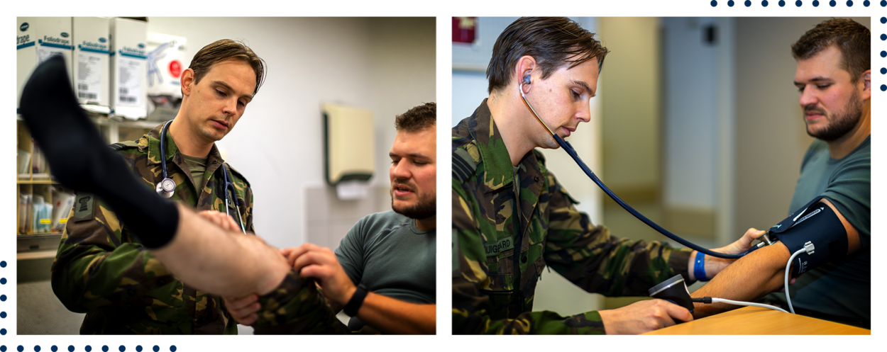 Onze zorgverlening gaat verder dan zieken beter maken. Je bent ook bezig met hoe je militairen fit en inzetbaar houdt. Daarvoor werk je samen met onder meer bedrijfsmaatschappelijk werkers, geestelijk verzorgers, fysiotherapeuten en Bureau Sport. Ons werk biedt dus veel afwisseling en bestaat zeker niet alleen maar uit spreekuren.”