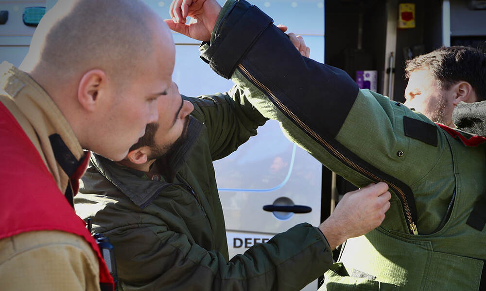 Voor de EOD is de informatievoorziening door de aanwezige luchtmachters van groot belang. Op basis daarvan maken zij een risicoanalyse. De robot neemt als eerste polshoogte. Ondertussen krijgt de brandweer een instructie over het 40 kilo zware bompak. Als het misgaat, moeten zij de EOD’er uit zijn outfit bevrijden. Knippen door het robuuste pak zal niet lukken, dus moet hij weten hoe het pak wel los gaat.