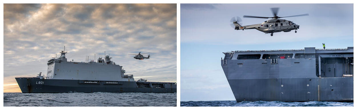 De oplossing werd gevonden bij Zr.Ms. Johan de Witt, die fungeert als drijvend vliegveld. “NH90’s opereren bij inzet ook vanaf fregatten”, gaat hij verder. “Eigenlijk is de samenwerking op een marineschip heel natuurgetrouw.” Oefenen vanaf het amfibisch transportschip was dus een noodgreep, maar de oplossing blijkt heel waardevol. “De oefening is hierdoor realistischer dan ooit. Een onverwacht mooie wending.”