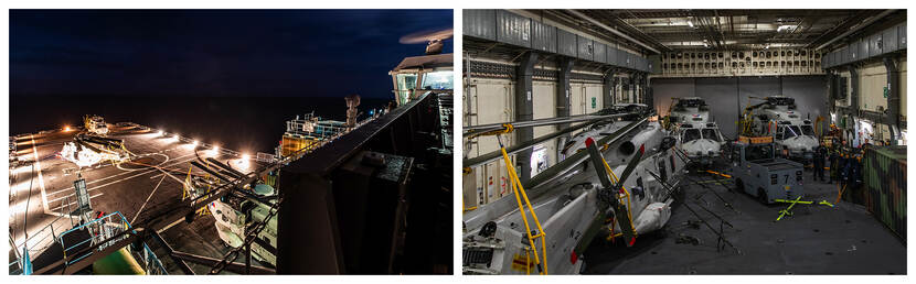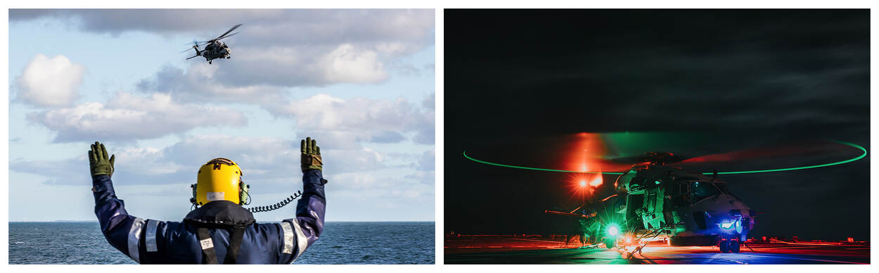 Met 60 opstappers maken de 3 NH90-crews en onderhoudsteams een substantieel deel uit van de 270-koppige bemanning op Zr.Ms. Johan de Witt. “In logistiek opzicht zijn 3 heli’s een stuk uitdagender dan 1 of 2”, weet sergeant-majoor Vincent van Ieperen, chef boordvliegploeg. Met 2 landingsspots kan de 3e kist pas naar buiten als de eerste 2 zijn opgestegen. “Dat klinkt makkelijker dan het is. Op het dek spreiden we de rotorbladen, starten we de heli’s op en helpt de vliegdekofficier de crew op weg. Pas daarna is de 3e kist aan de beurt.” Bij terugkomst moet alles in omgekeerde volgorde binnen worden gebracht. “De monteurs leveren topprestaties om alles zo vlekkeloos mogelijk te laten verlopen. Als ik kijk naar de hoeveelheid vliegbewegingen en onderhoud ben ik trots op de prestatie die is neergezet.”