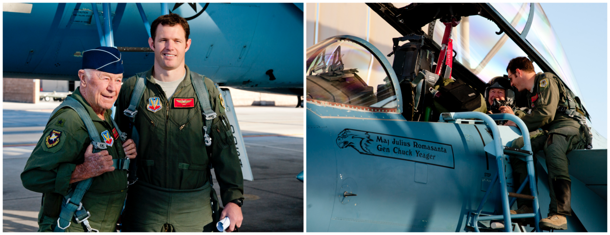 Precies 65 jaar na zijn historische vlucht vliegt Chuck Yeager op 89-jarige leeftijd nog 1 keer sneller dan het geluid. Deze keer achterin de 2-persoons F-15 van kapitein David Vincent van het 65th Aggressor Squadron. Foto: Amerikaanse luchtmacht, Master Sergeant Jason Edwards