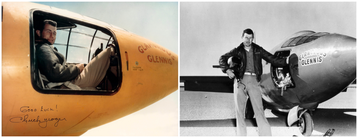 Chuck Yeater met de Bell X-1. Net als al zijn andere persoonlijke vliegtuigen was ook de X-1 voorzien van de naam van zijn eerste vrouw: Glamorous Glennis. De linkse afbeelding is een scan van een gesigneerde foto door Chuck in 1994.