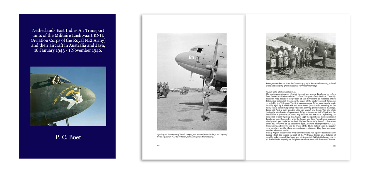 ‘Netherlands East Indies Air Transport units of the Militaire Luchtvaart KNIL’ met ISBN 9789491993176, is geschreven door Peter Boer, samengesteld door Theo Wesselink en uitgegeven in eigen beheer door Dutch Aviation Publications. De softback op formaat 15 x 23 cm telt 164 pagina’s en is voorzien van 5 kleuren- en 130 zwart-witfoto’s. Het boek kost €29,95 en is te koop bij de Flash Luchtvaartwinkel in Eindhoven en Aviation Megastore in Aalsmeerderbrug. Ook is het bestelbaar bij iedere boekhandel, via www.blurb.com of op Wesselinks website. Kijk daarvoor en voor meer informatie op www.dutchavia.nl.