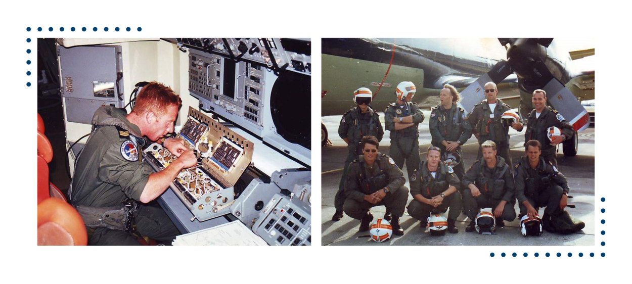Zijn eerste 25 jaar bij Defensie werkt Jan bij de Marineluchtvaartdienst. Hier op de foto in de P-3C Orion en met de vliegtuigbemanning tijdens de Kosovo-oorlog. Foto’s: uit privé-archief