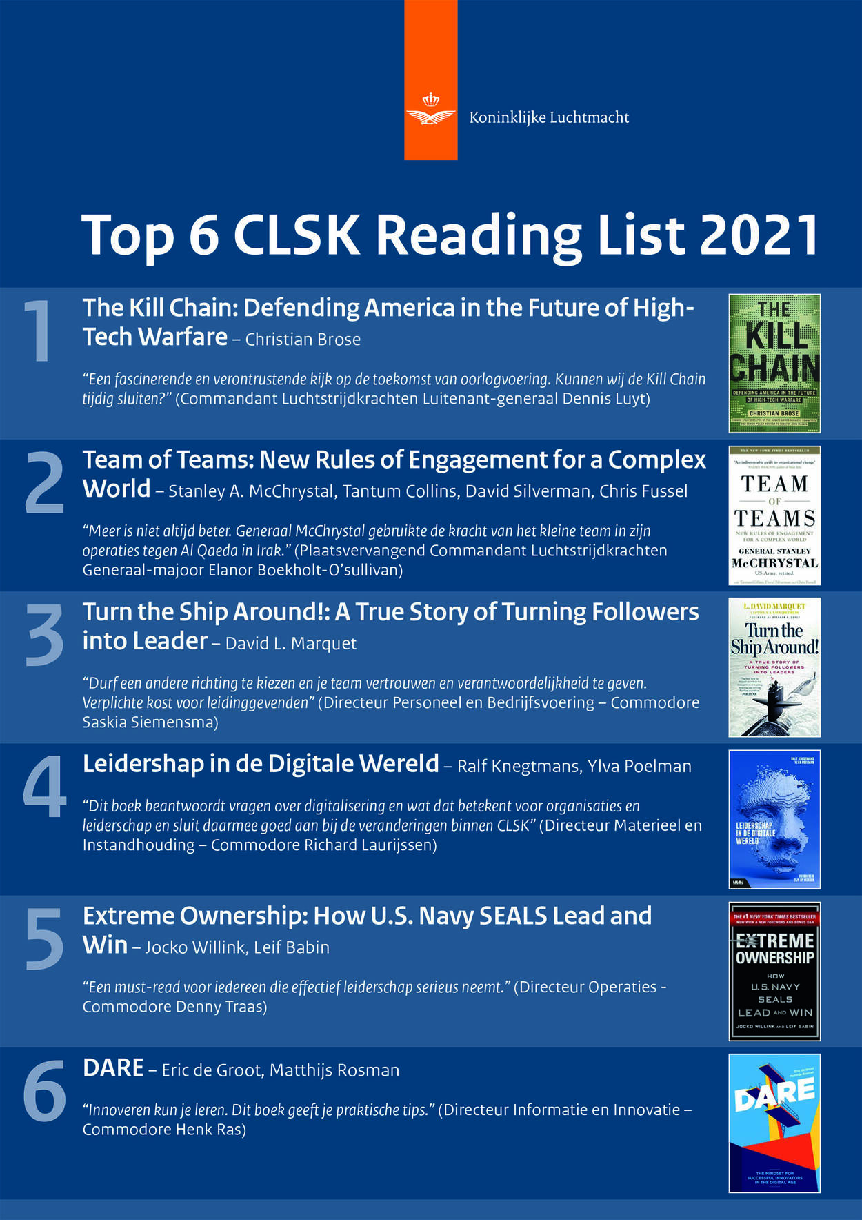 Thuisblijven tijdens corona, voorjaarsvakantie, gewoon ’s avonds of in het weekend: momenten genoeg om te lezen. Geen inspiratie voor een goed boek? Geen probleem. De luchtmachtleiding stelde samen met een aantal collega’s in het land een CLSK Reading List op. In de eerste editie vindt u de Top 6 aanbevolen boeken door de Luchtmachtraad.