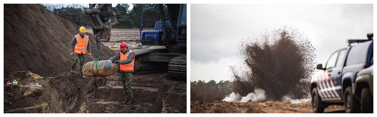 De Explosieven Opruimingsdienst Defensie bracht ze op 17 maart tot ontploffing op het militaire oefenterrein Oirschotse Heide. Abusievelijk is eerder in de media vermeld dat de bommen afkomstig waren van Vliegbasis Gilze-Rijen. Foto’s: korporaal 1 Max Mostert