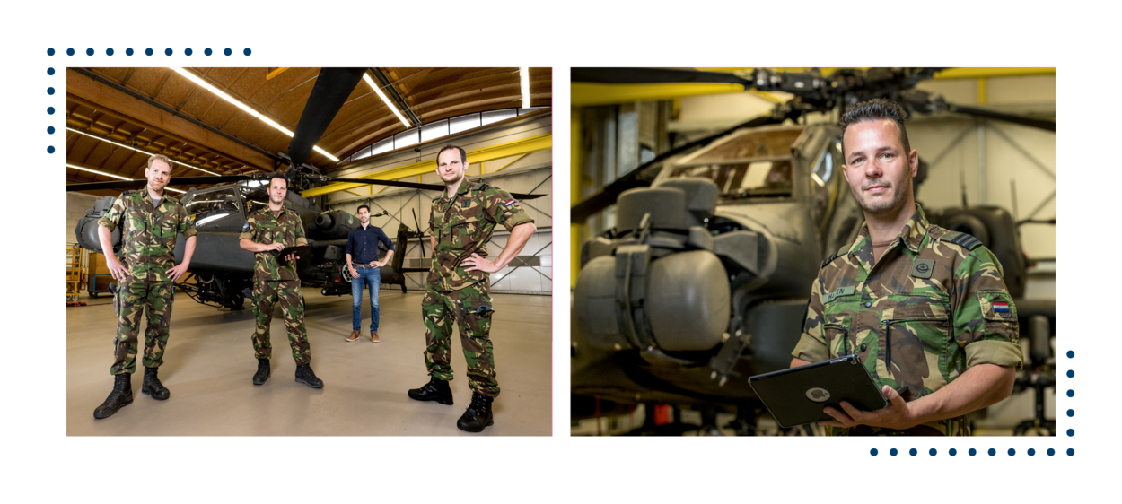 301 Squadron is één van de klanten. Hoofd Gereedstelling & Onderhoud majoor Mathijs (links) bedacht tijdens zijn afstudeeronderzoek aan de TU Delft slimme software voor het maken van diverse jaarplanningen. Data scientist Bram (midden achter) deed de technische vertaalslag en maakte er een bruikbare tool van die hoofd Bedrijfsbureau kapitein Tom (rechts) maar wat graag gaat gebruiken.