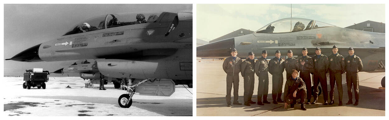 Links: Sneek – nog met zijn helm van het 315 Squadron op – voor zijn eerste vlucht in een F-16. Rechts: De enige student met negen instructeurs.