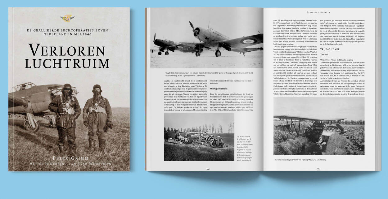 ‘Verloren luchtruim – De Geallieerde luchtoperaties boven Nederland in mei 1940’ met ISBN 9789082858181, is geschreven door Peter Grimm en Jaap Woortman en uitgegeven door Uitgeverij Geromy bv. De hardback op formaat 31,3x30,4 cm telt 480 pagina’s, is voorzien van bijna 300 foto’s en 8 pagina’s kleurenprofielen (zijaanzichten). Het boek kost € 58,00. Het is in kleine oplage gedrukt en daarom alleen verkrijgbaar bij Geromy ( https://geromybv.nl ), Flash en de Aviation Megastore.