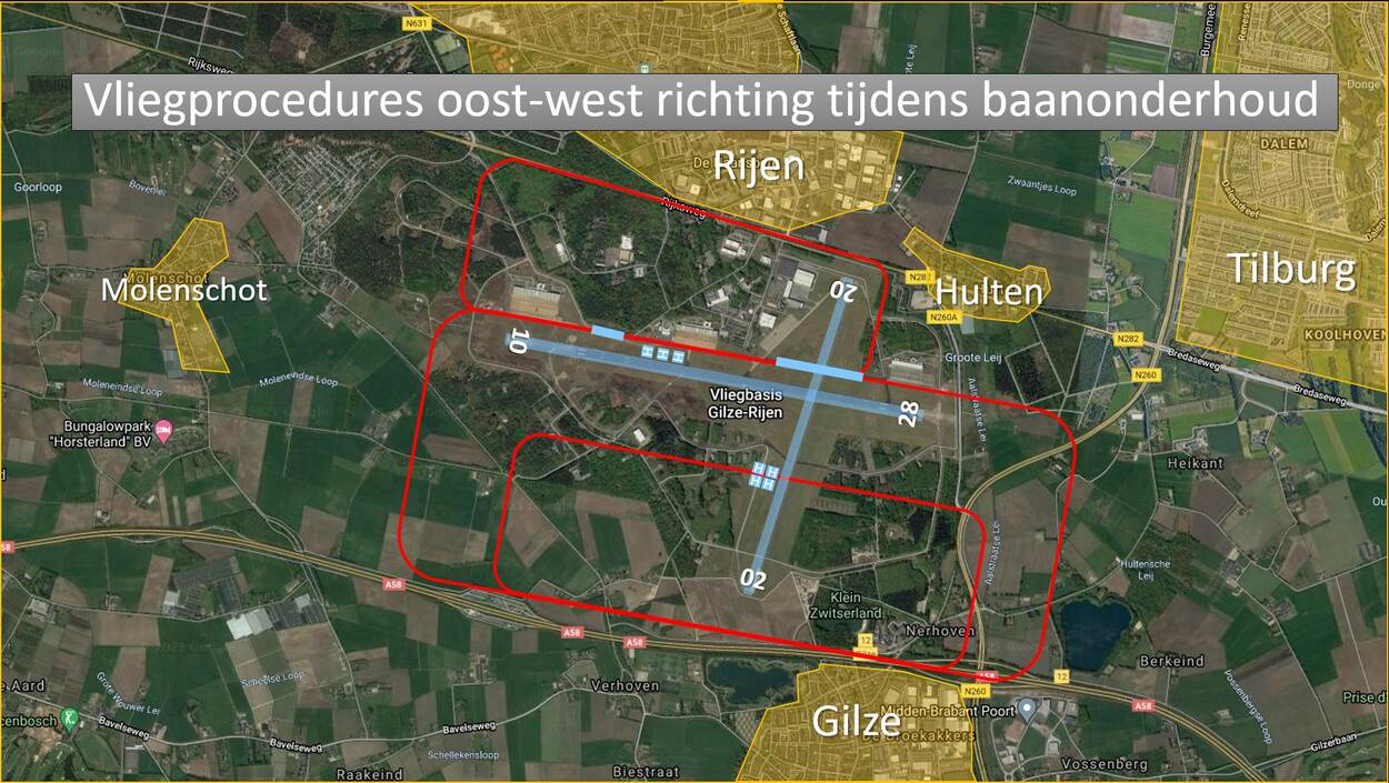 Tijdens de baanrenovatie vliegen de helikopters andere routes dan gebruikelijk omdat ze niet van de startbanen gebruik kunnen maken. Daarom vindt een deel van het circuitvliegen en andere lokale training plaats vanaf de Vliegbases Volkel en Woensdrecht. Hierdoor is het aantal vliegbewegingen op Gilze-Rijen tijdelijk lager. Voor de oost-westrichting is een aantal alternatieve start- en landingspunten aangewezen. Voor deze punten maken de helikopters hoofdzakelijk gebruik van een circuit ten zuiden van de hoofdbaan. Daarmee voorkomt het Defensie Helikopter Commando (DHC) dat helikopters veelvuldig om Hulten heen moeten vliegen. De circuits in de noord-zuidrichting blijven onveranderd. Op deze manier probeer het DHC het geluid zoveel mogelijk te spreiden en zo evenredig mogelijk te verdelen in de omgeving.