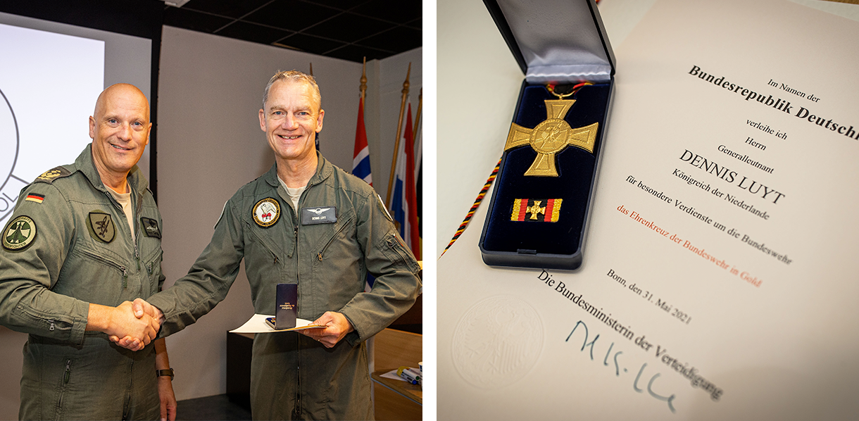 Tijdens zijn bezoek aan de Weapon Instructor Course (WIC) op Leeuwarden afgelopen 30 september verraste de Duitse luchtcommandant luitenant-generaal Ingo Gerhartz zijn Nederlandse evenknie met het ‘Erekruis van de Bundeswehr’ in goud. Commandant Luchtstrijdkrachten luitenant-generaal Dennis Luyt ontving de onderscheiding als beloning voor de goede samenwerking tussen de twee luchtmachten.