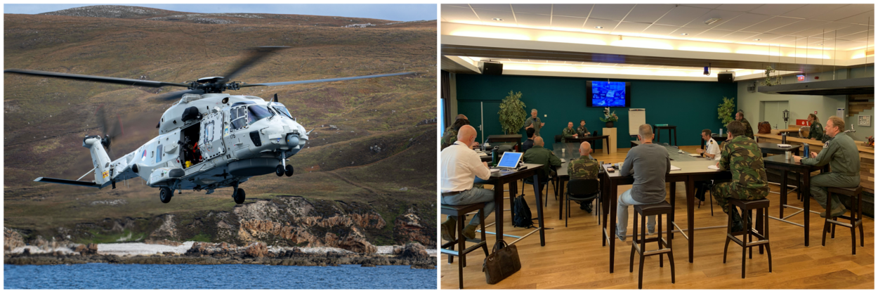 Tijdens een sessie ‘digitalisering slagveld’ leggen operators de geavanceerde mogelijkheden van de NH90 uit aan specialisten van onder meer Intell, AirC2, IT, data en cyber. Uiteraard lag de focus op de sensoren en verbindingsmiddelen. Foto links: sergeant-majoor Maartje Roos; rechts: Linda de Looper