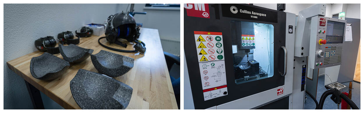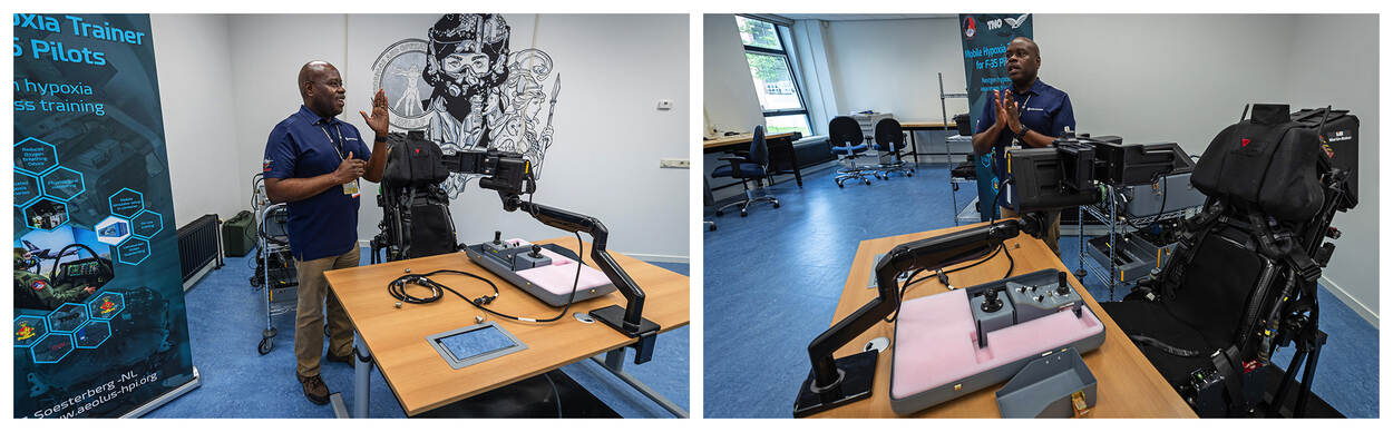 Dat kan, want Collins stuurt twee man naar Soesterberg waar ze samen met Meeuwsen in twee doorsnee kantoorruimtes het PRC bouwen. In Amerika gebruiken ze daar veel grotere ruimtes voor. Het PRC werkt met een prototype scanner om vliegers op te meten, nauwkeurig tot op een tiende millimeter. Daar heb je zeker een groot apparaat voor nodig? “Zeker niet”, zegt Meeuwsen. “Het is nu nog een beetje een log apparaat, maar over een paar jaar is die scanner zo groot als je huidige smartphone. In de andere ruimte staat een prototype van een freesmachine die in twintig minuten een complete binnenkant van de helm maakt. En het wérkt geweldig. Dat testen we namelijk meteen. Daarvoor hebben we hier een complete instelling met een F-35 schietstoel staan.”