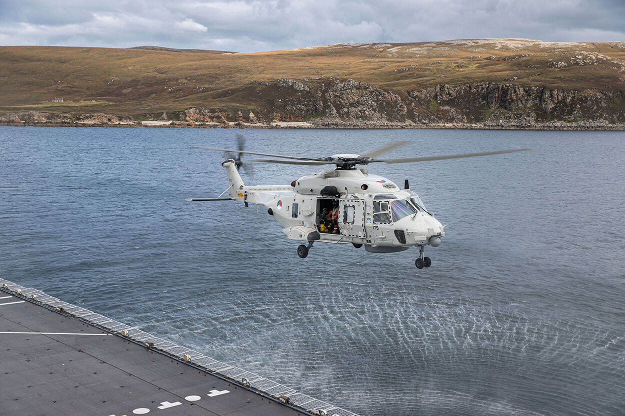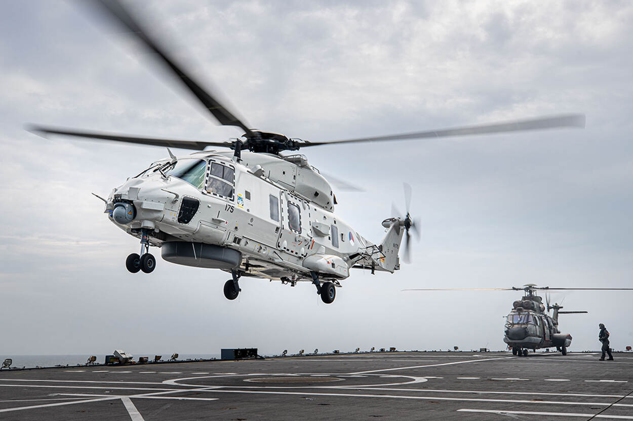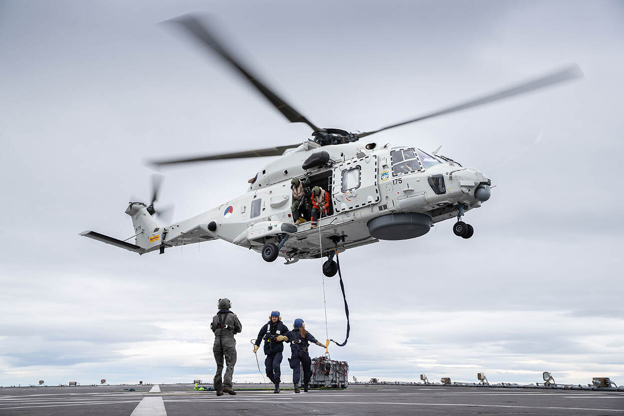 De helikopters voeren mee aan boord van logistiek ondersteunings- en bevoorradingsschip Zr.Ms. Karel Doorman. “Opereren vanaf zo’n groot schip met meerdere vliegcrews, was best even wennen”, vertelt majoor der mariniers Jan Parlevliet, die nauw betrokken is bij de oprichting van de amfibische tak van de NH90. “Meestal opereren we maar met één heli, één crew en één onderhoudsploeg vanaf een dek met maar één helispot. Dan ben je met elf man. Nu bestond het helidetachement uit vijftig man en opereerden we vanaf een schip met twee helispots dat vele malen groter was dan we gewend zijn.” Ook de integratie op en aansturing van het schip had daardoor tijd en aandacht nodig. “De lijnen waren er letterlijk en figuurlijk langer.”