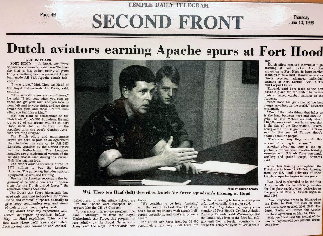 Fort Hood is een belangrijke plek voor het US Army helikopteroptreden. Daarom strijken daar in 1996 ook Nederlandse vliegers en technici neer om te leren opereren met de Apache. Vanaf januari 1997 gaan zij het 301 Squadron vormen op Gilze-Rijen. Onder hen de dan nog toekomstige commandant majoor Theo ten Haaf. Volgens hem zijn er vier redenen om naar deze plek te komen. “In de eerste plaats omdat hier goed wordt lesgegeven, ten tweede heeft het concept van de training van 21st Cavalry Combat Aviation Training Brigade (CAT-B, red.) zich bewezen.” Als derde noemt de inmiddels generaal-majoor b.d. de ervaring die de US Army dan al heeft met de Apache en tot slot de uitstekende trainingsmogelijkheden in een weids gebied.