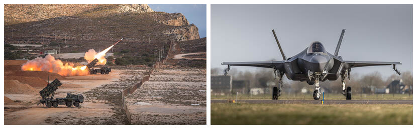 Ook Nederland moet volgens de onderzoekers een rol spelen in de ontwikkeling en versterking van deze capaciteit. Plaatsvervangend Commandant der Strijdkrachten vice-admiraal Boudewijn Boots, tevens voorzitter van de Joint Integrated Air & Missile Defense Board, zei dat deze ontwikkeling moet worden versneld, onder meer met het oog op het grotere Defensiebudget. Hij riep de aanwezige partijen op om dit samen met Defensie mogelijk te maken. Archieffoto’s: sergeant-majoor Hille Hillinga (l.) en sergeant 1 Jan Dijkstra (r.)