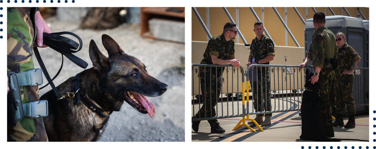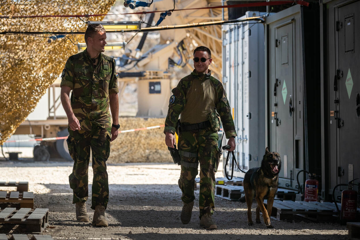 Als S3 Ground ben ik hier verantwoordelijk voor de bewaking en beveiliging en daarmee dus mede-verantwoordelijk voor de operationele inzetbaarheid van de Reaper. We patrouilleren 24/7 en lopen met scherp. Dit is geen oefening. Verder is het klimaat een uitdaging. Als mens moet je acclimatiseren, maar als dier ook. De meeste hondengeleiders vlogen voor het eerst met hun hond. Ook dat was spannend, ondanks de kennis en ervaring die we op de hondensectie hebben.