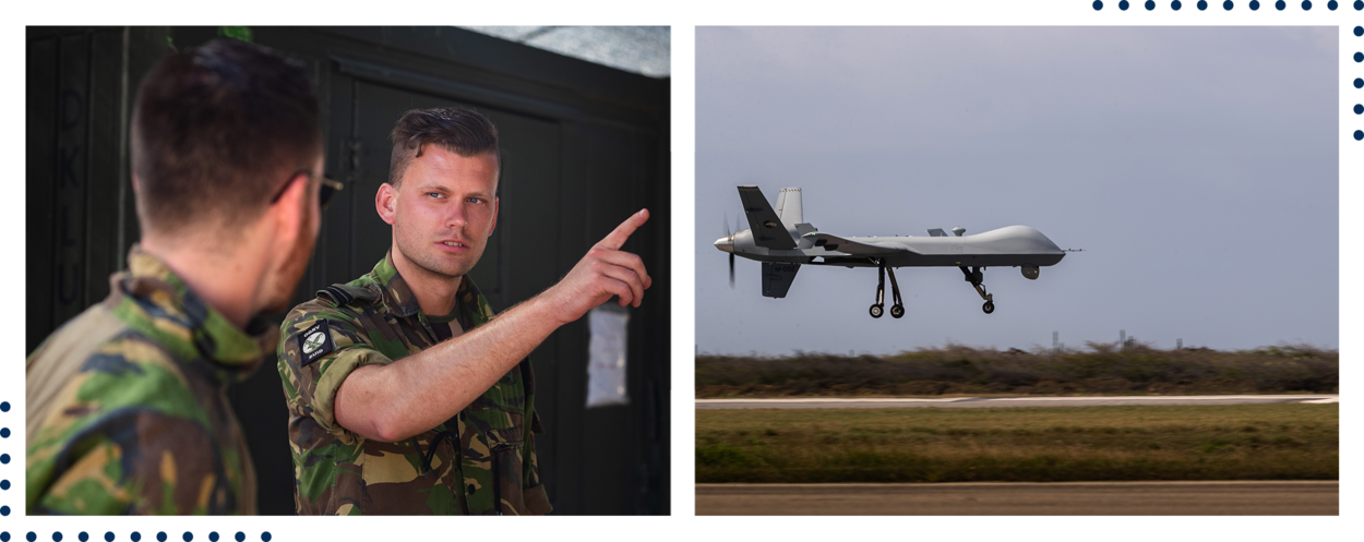 “Momenteel zit ik met een detachement van zestien man – inclusief mijzelf – en vijf honden op Curaçao in verband met de Reaper die hier zijn operationele test- en evaluatiefase draait. In de periode voor ons vervulde OGRV Noord deze taak. We beschermen en bewaken hier al ons eigen materieel. Het Amerikaanse beveiligingssquadron dat hier ook zit, we zijn te gast op een Amerikaanse Forward Operating Location, is alleen verantwoordelijk voor het eigen materieel. Vandaar dat we zijn aangeklikt aan het detachement van 306 Squadron uit Leeuwarden.