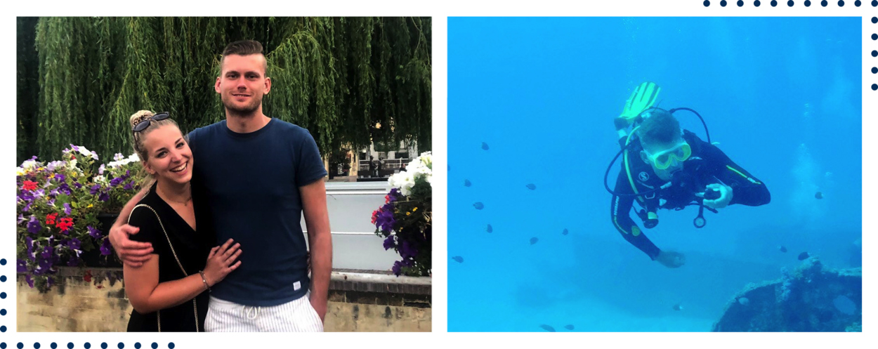 Privé reis ik graag. Met een lichtingsgenoot van de KMA ben ik naar Mauritius en Madagaskar geweest. En met een aantal vrienden houden we vooral van reizen op de bonnefooi. Twee jaar geleden hadden mijn vriendin Britt en ik een reis naar Thailand gepland. Maar helaas ging op de dag van vertrek Thailand op slot door corona. Als ik op vakantie ben, duik ik graag. Dat kan ik nu op Curaçao in mijn vrije tijd ook doen. Dat is mooi meegenomen.”