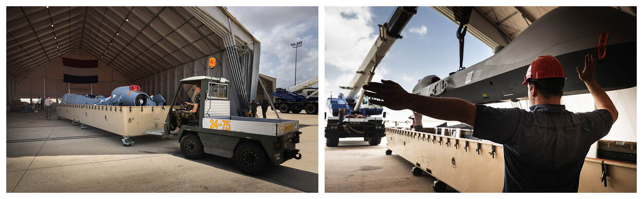Technici zetten samen met personeel van de Amerikaanse leverancier de drie Reapers in elkaar.