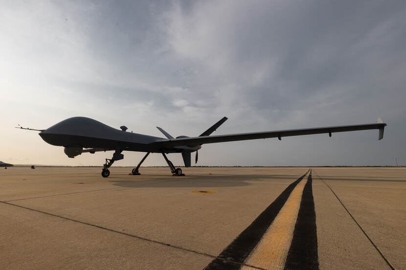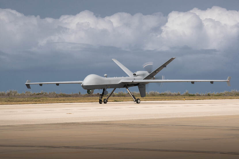 “Vier vliegers op Curaçao hebben de eerste vlucht gevlogen. Een crewwissel tijdens de missie is namelijk prima uitvoerbaar bij een cockpit op de grond. Samen met een collega ben ik als enige gecertificeerd om met de Reaper op te stijgen en weer te landen, daarom deed ik de take off. Vervolgens heb ik een half uur gevlogen. Dat was supergaaf. ‘Eindelijk, daar gaan we dan’, dacht ik met een grote lach.